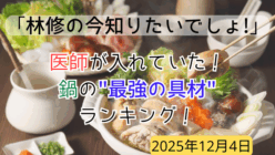 2025年12月4日の「林修の今知りたいでしょ!」は、「医師が入れていた!鍋の最強具材スペシャル」!インフルエンザ、血管トラブル、肌トラブルの3部門で、医師がオ ..... Read More